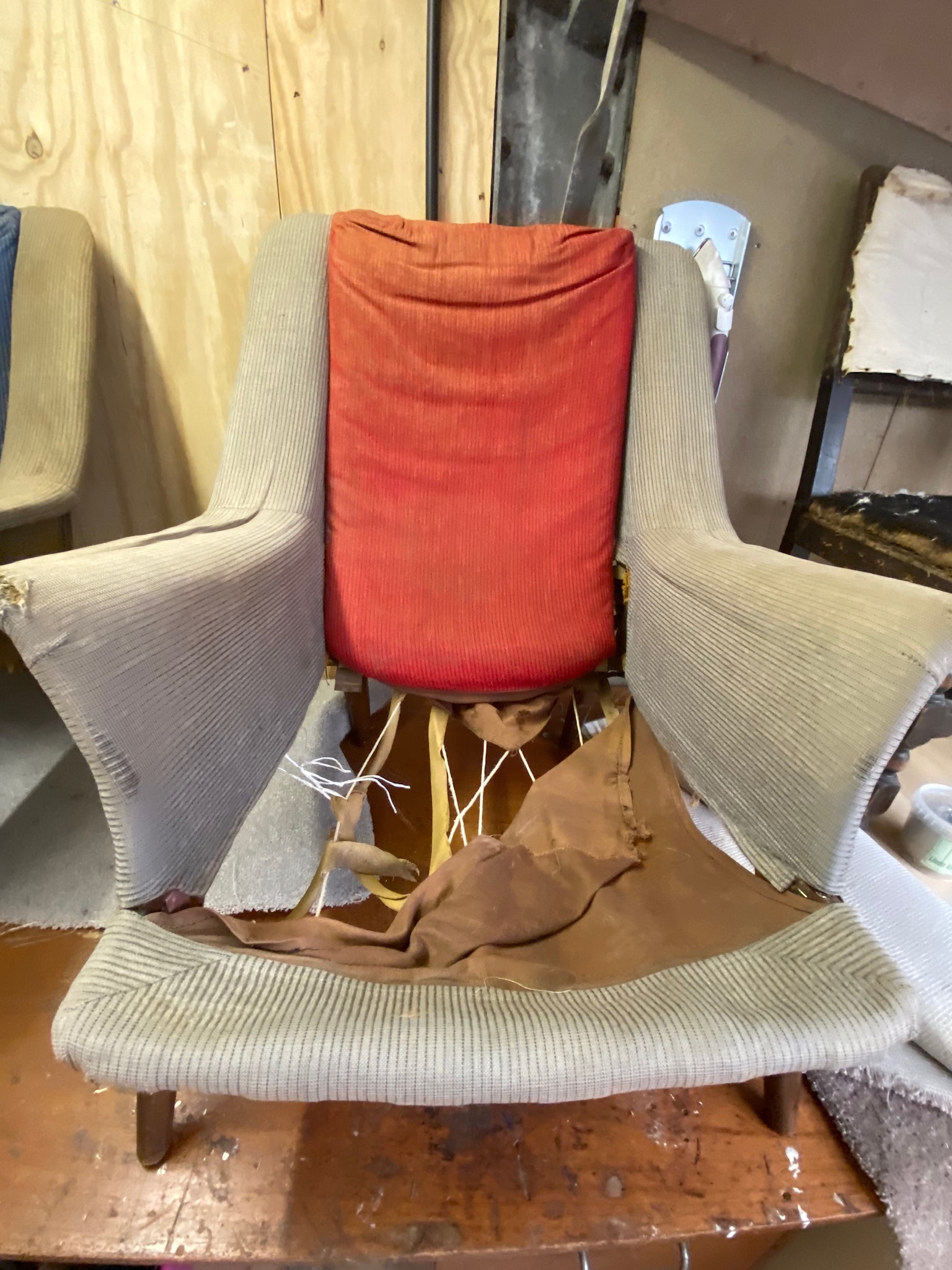 They are completely original although missing their seat cushions and have never been reupholstered. They have a metal frame but with Pirelli webbing on the seat and back, held in place with metal clips and brackets. The arms have a layer of horsehair and foam has been used before the top cover which has been secured in place by pop on rivets similar to ones found on a classic car tonneau cover. The material used to cover the metal frame on the inside arms is black and similar to again a classic car door panel – one can see it under the horsehair in one of the pictures. The back cushions are also filled with horsehair and the legs are wood but a typical mid century shape.  Some aspects of their design echo Ernest Race and his Flamingo chair and if anyone can shed some light on these, it would be greatly appreciated. We don’t want to start restoring them just yet in case they are something special. That and they look as if they’ll be a nightmare to do…laughing face.