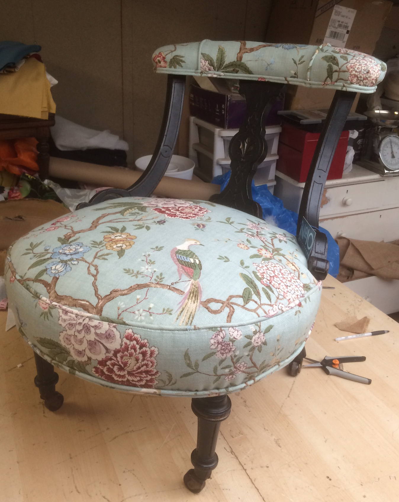 Ebonised Victorian Small Nursing chair, recovered in GP Baker Linen.