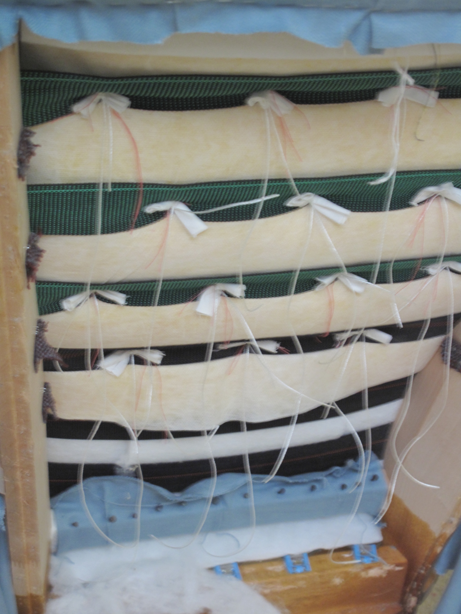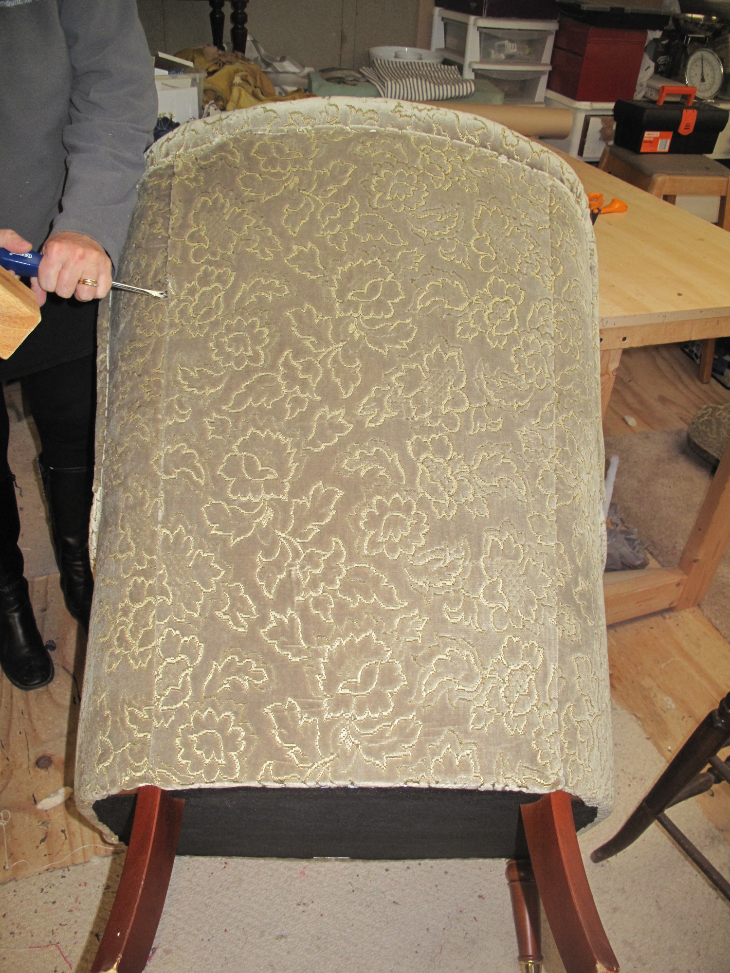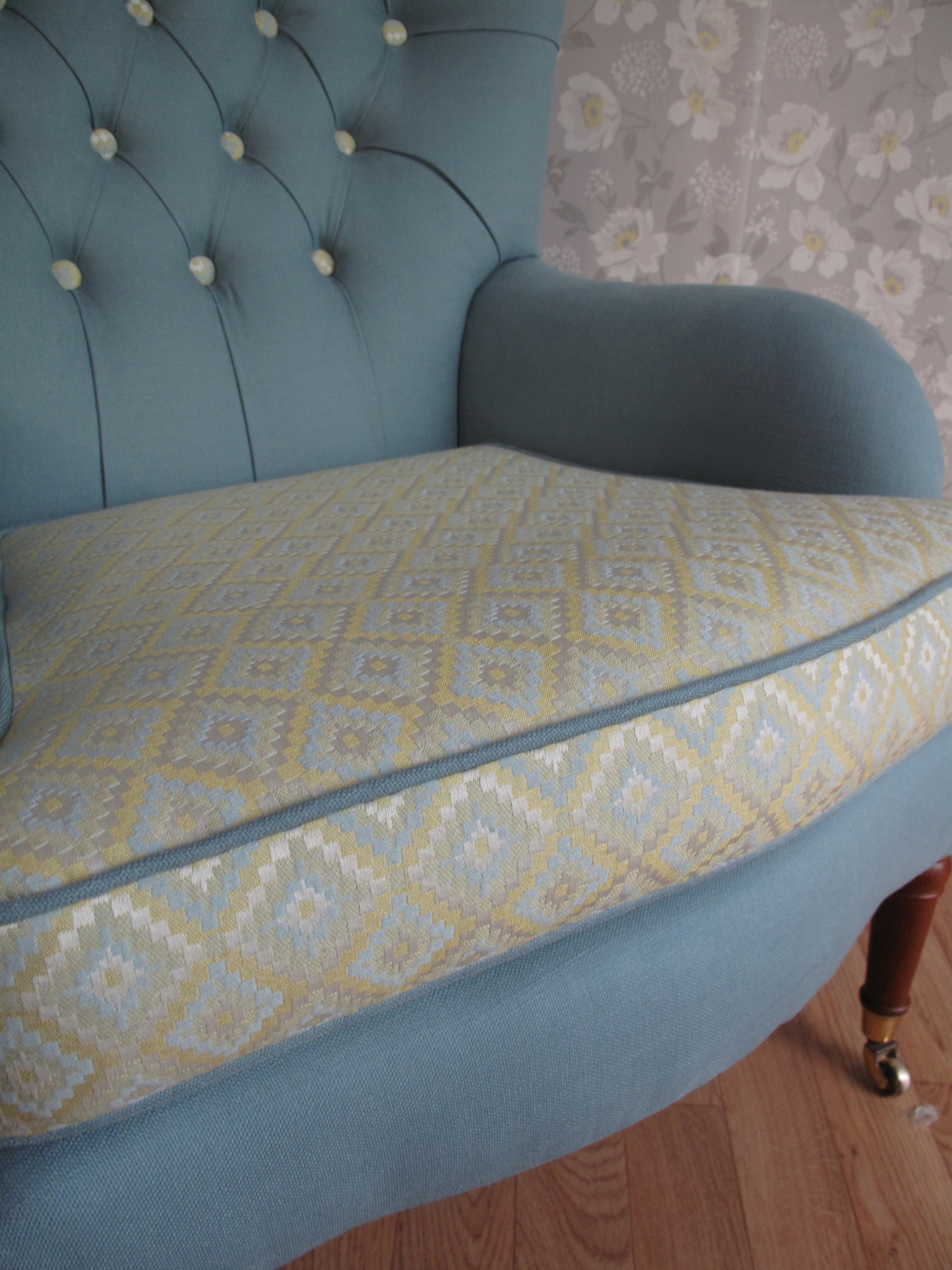 Modern Parker Knoll Button Back, re-upholstered using a Duck Egg Clarke & Clarke brushed cotton. Contrast buttons and cushion recovered with a Blendworth fabric.