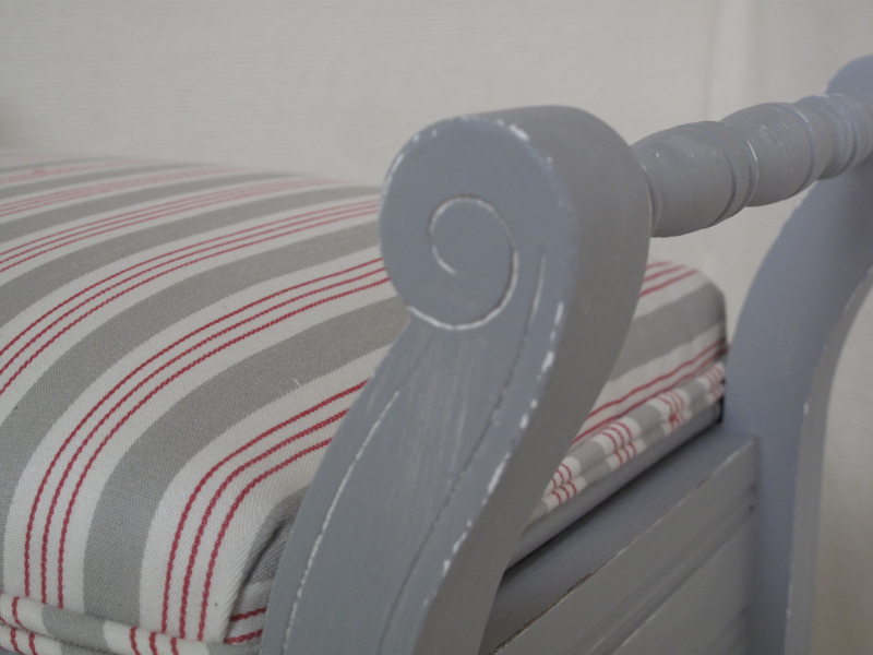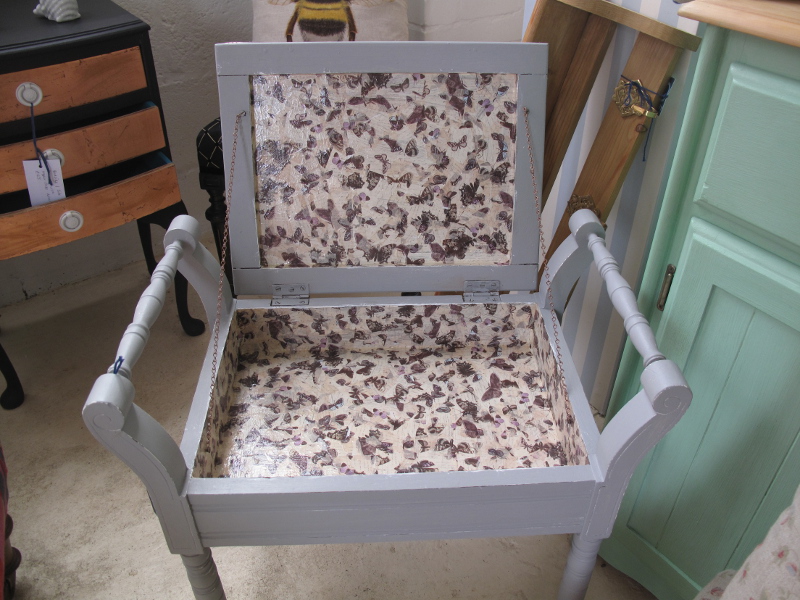 The piano stool was painted and waxed whilst a butterfly theme was applied to the inside using decoupage. The top of the stool was newly reupholstered using a contrast grey and pink striped fabric.