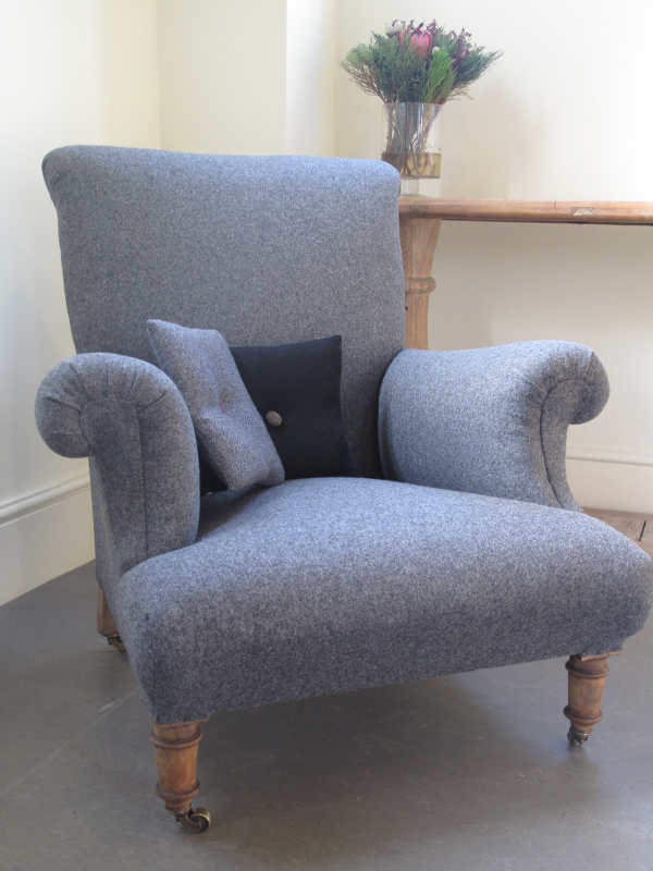 Originally covered in a 1980s faux leather, this lovely Victorian Armchair was reupholstered using an Abraham Moon wool.