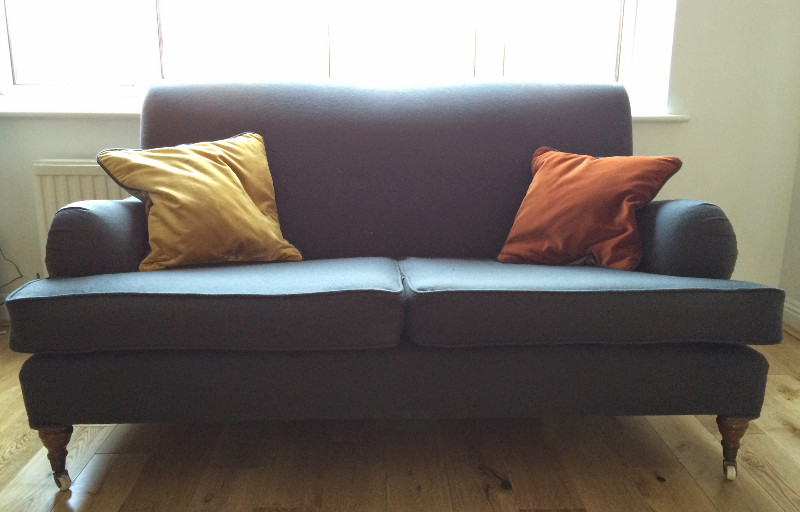 This modern 1990s sofa with an antique vintage style was given a new look using Abraham Moon grey wool.