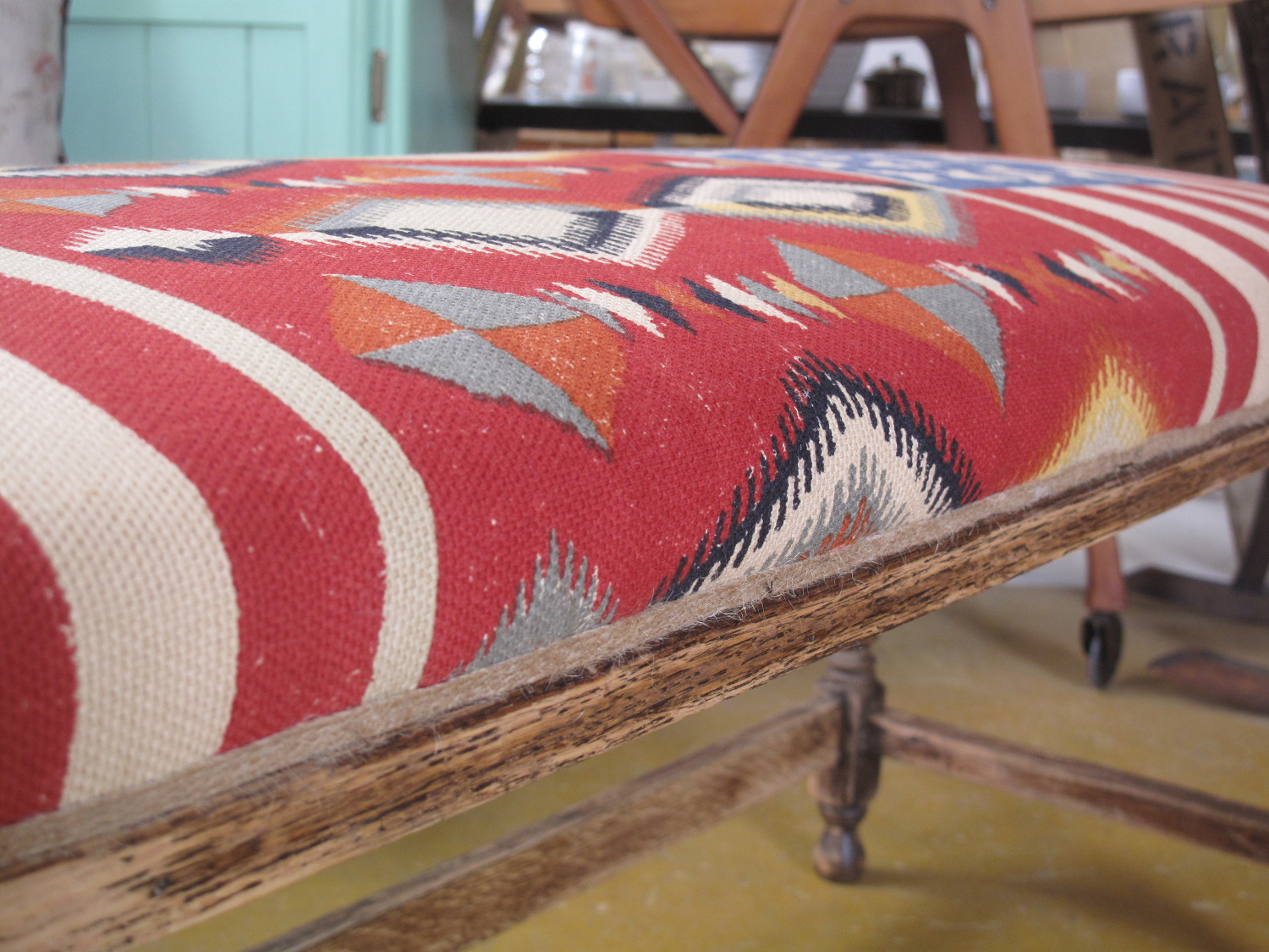This large oak vintage footstool/window seat was sanded back and waxed and then reupholstered using Andrew Martin “Glory”.