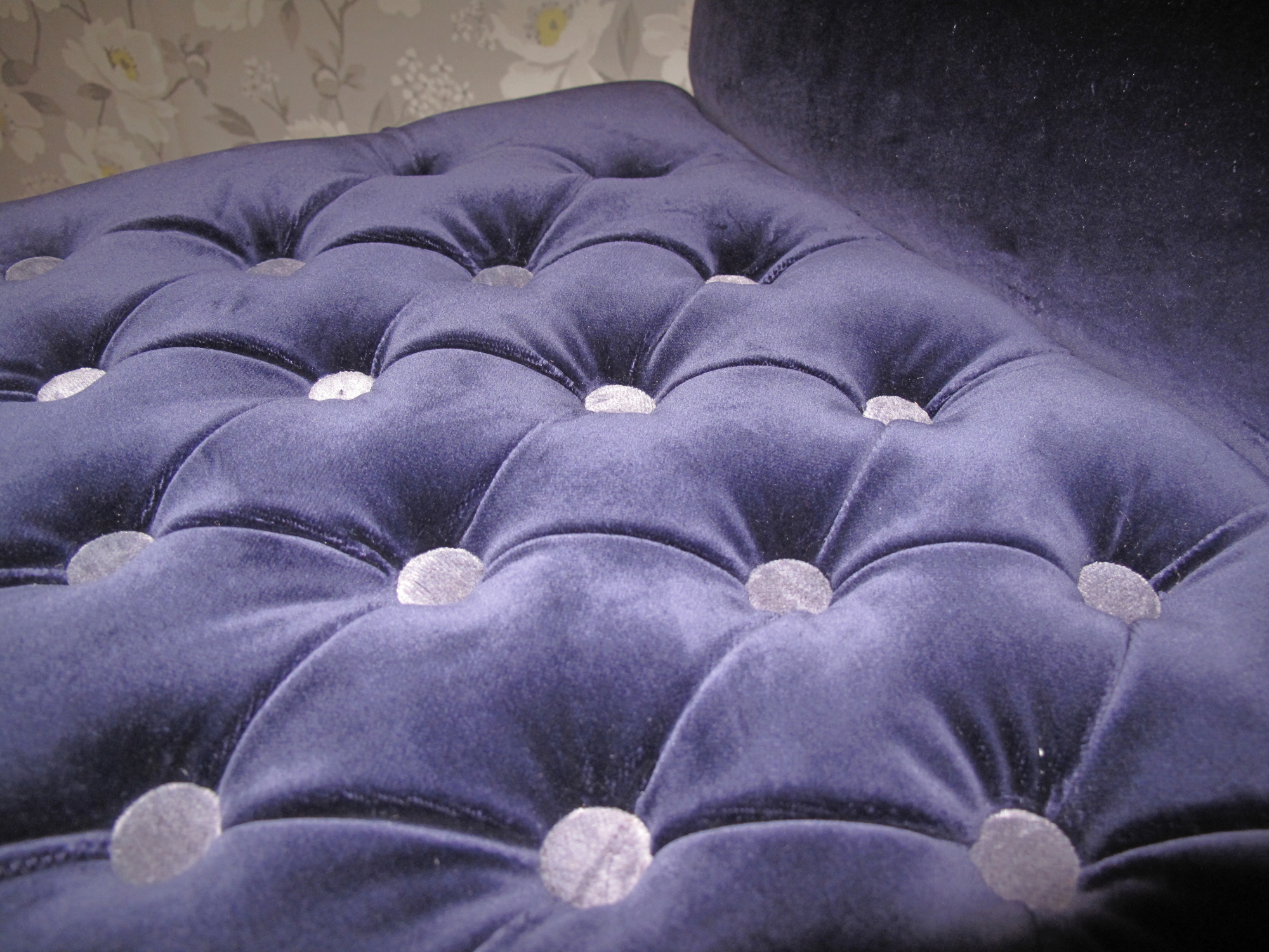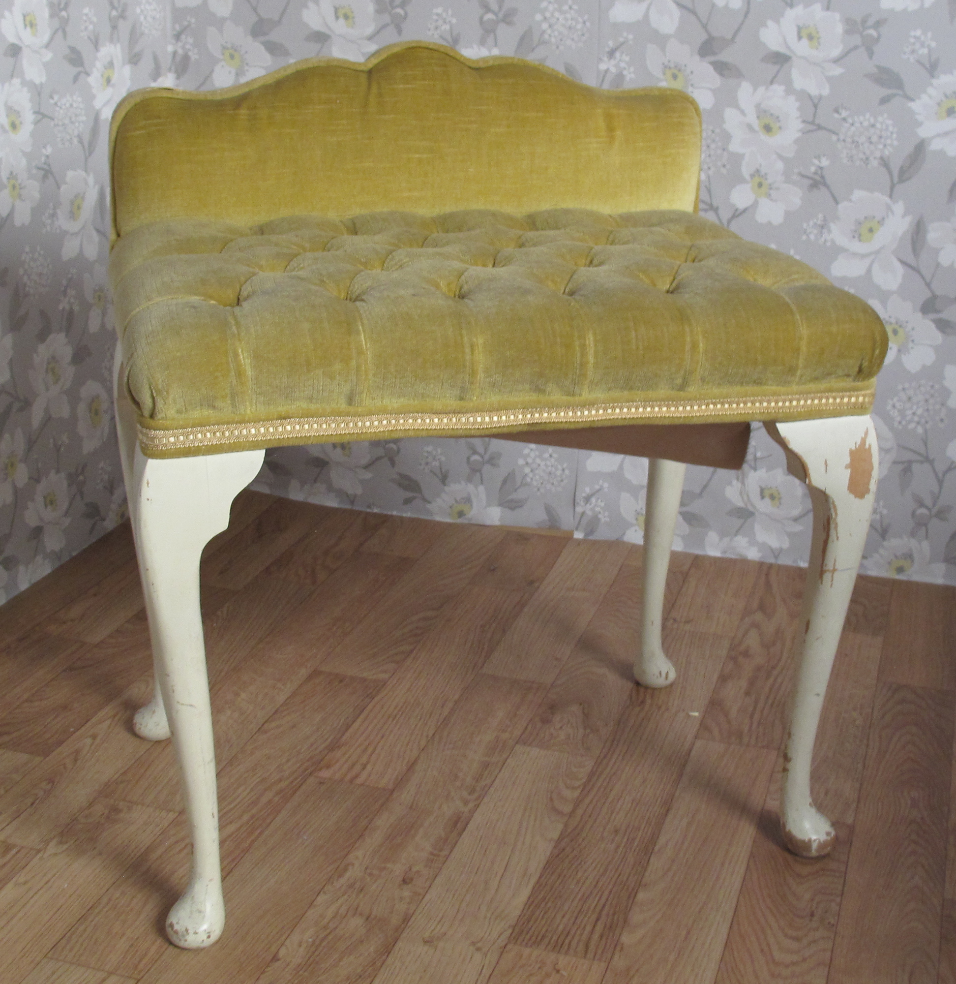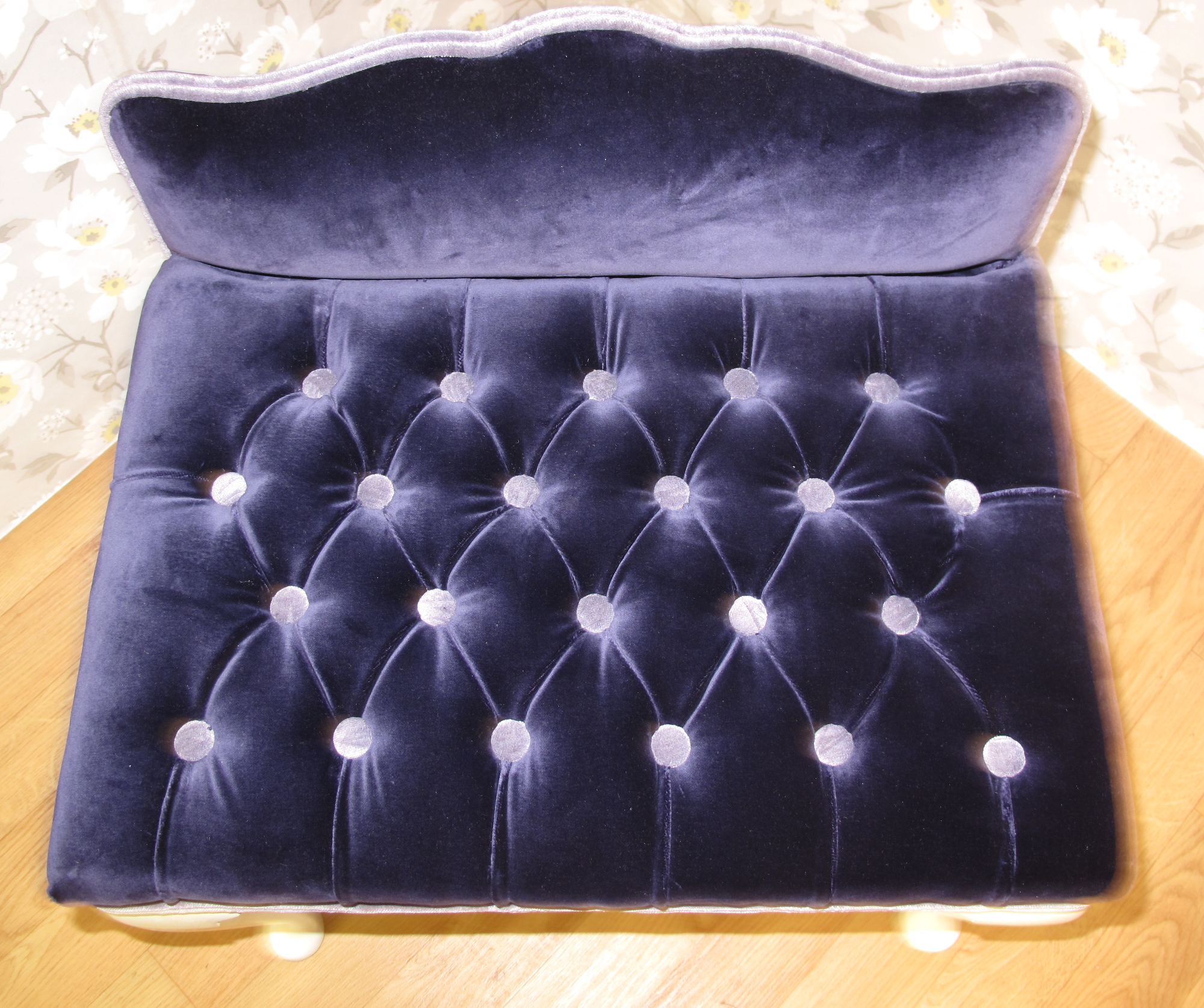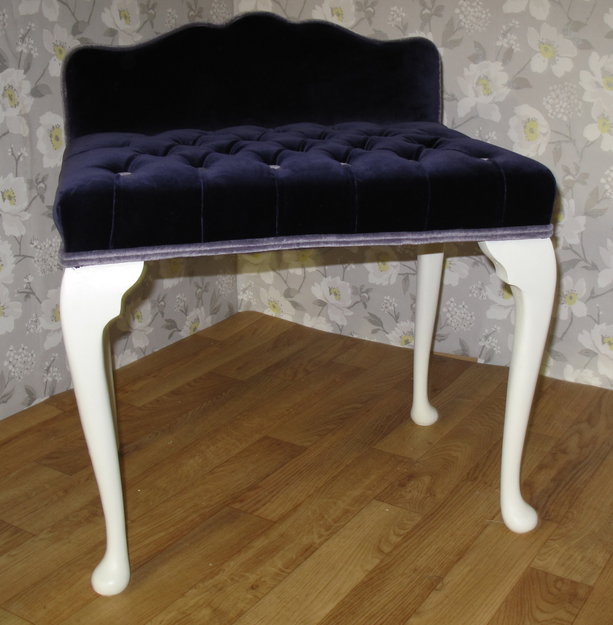 A dated dressing table stool, recovered in a lush purple velvet. Buttoned in a contrast vintage velvet.