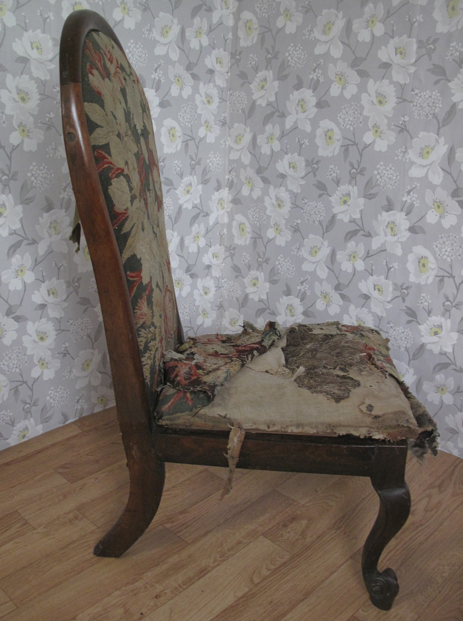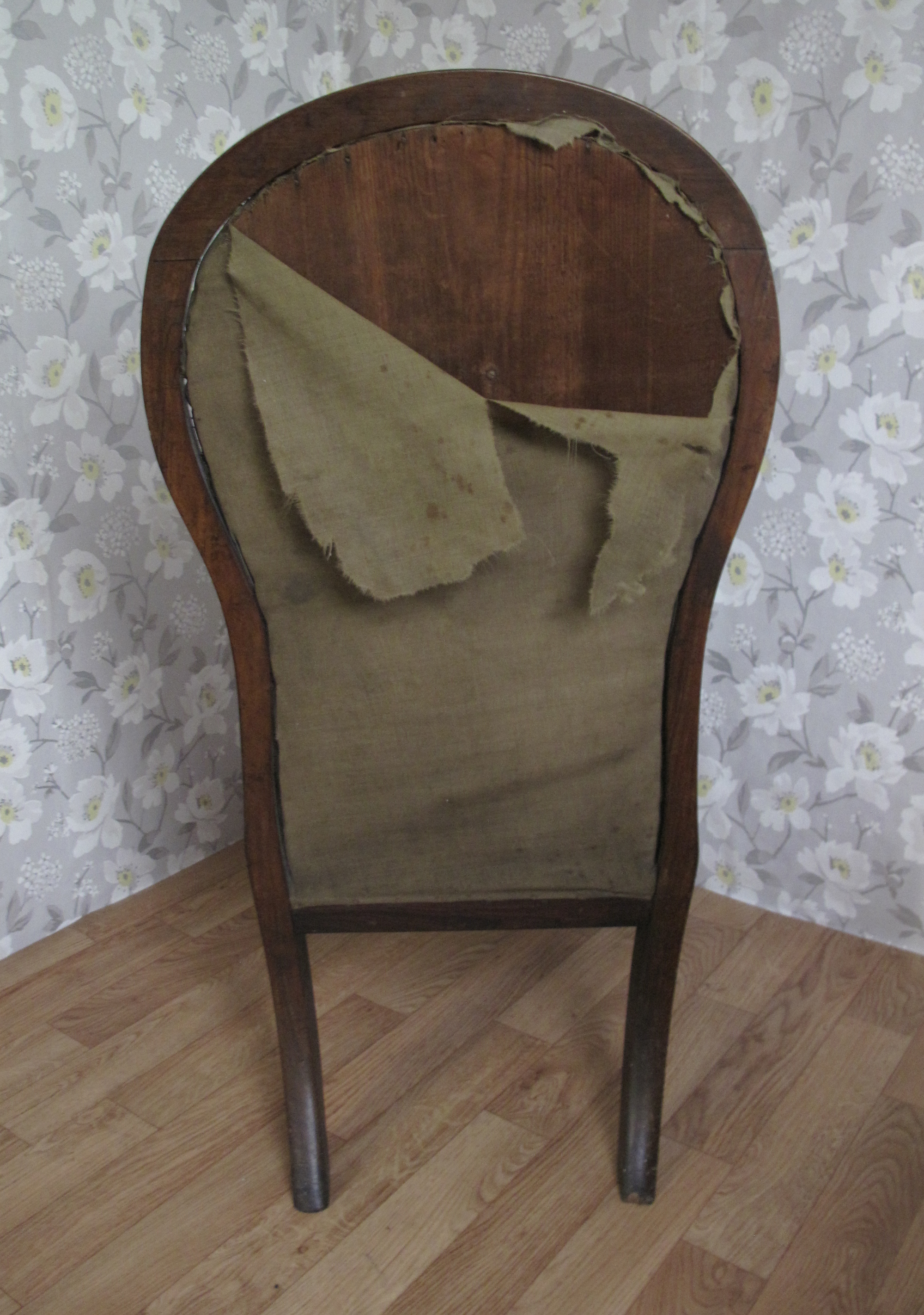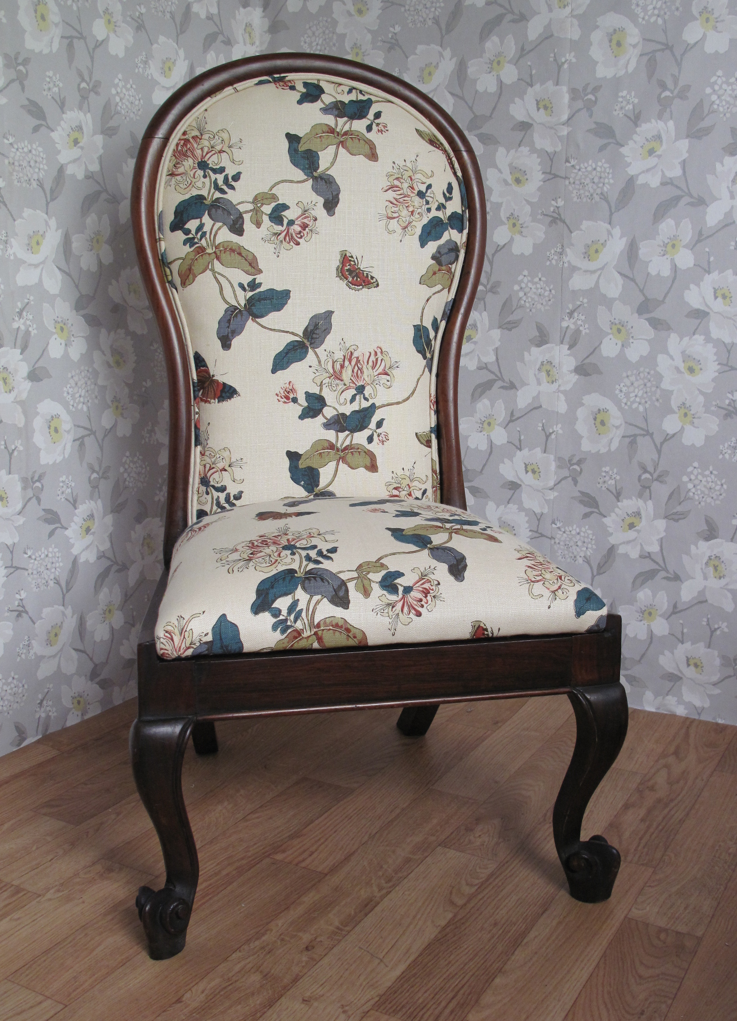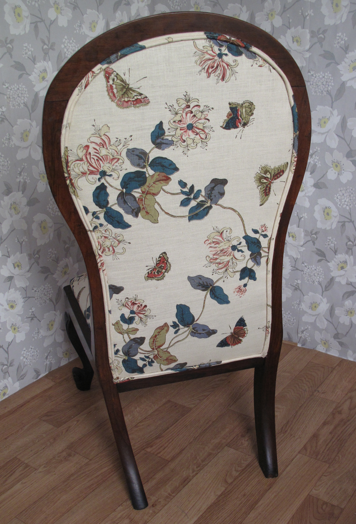 Fabulous Victorian Chair which had originally been covered in a tapestry. The seat was a drop in whilst the back was a panel. When stripping the chair back we found the original linen calico and the rear of the chair had been covered in silk. It was reupholstered using a linen with a delicate butterfly and foliage design.