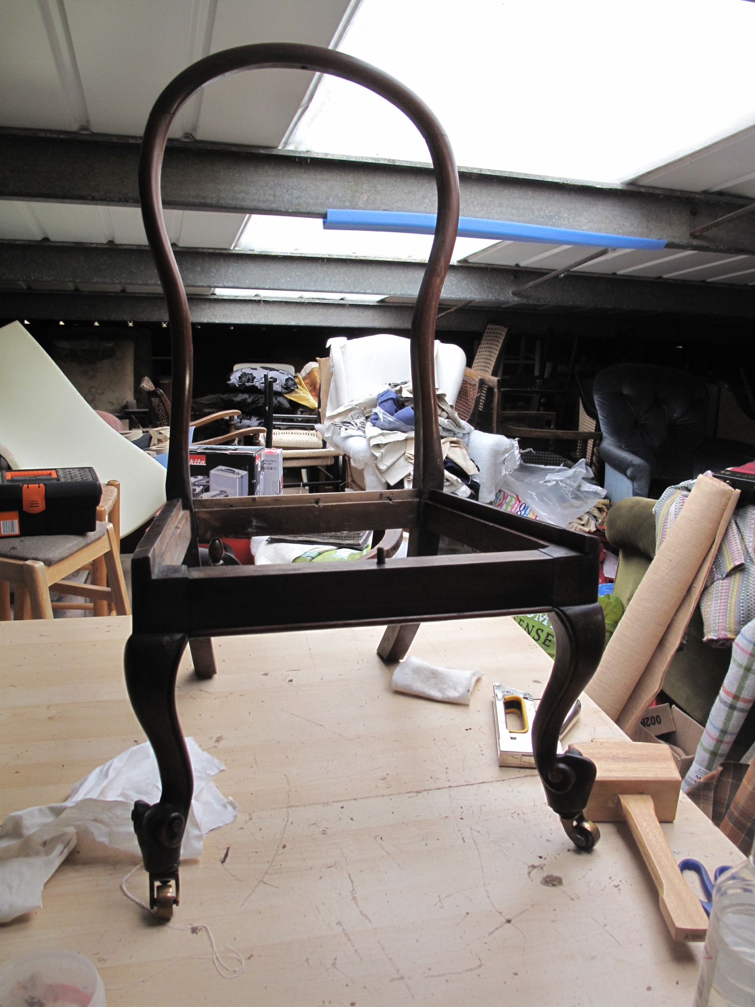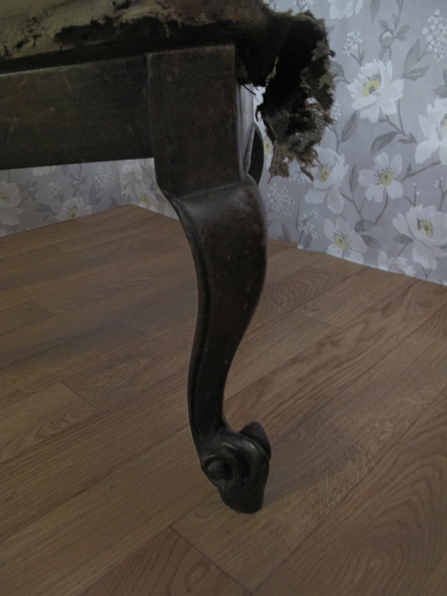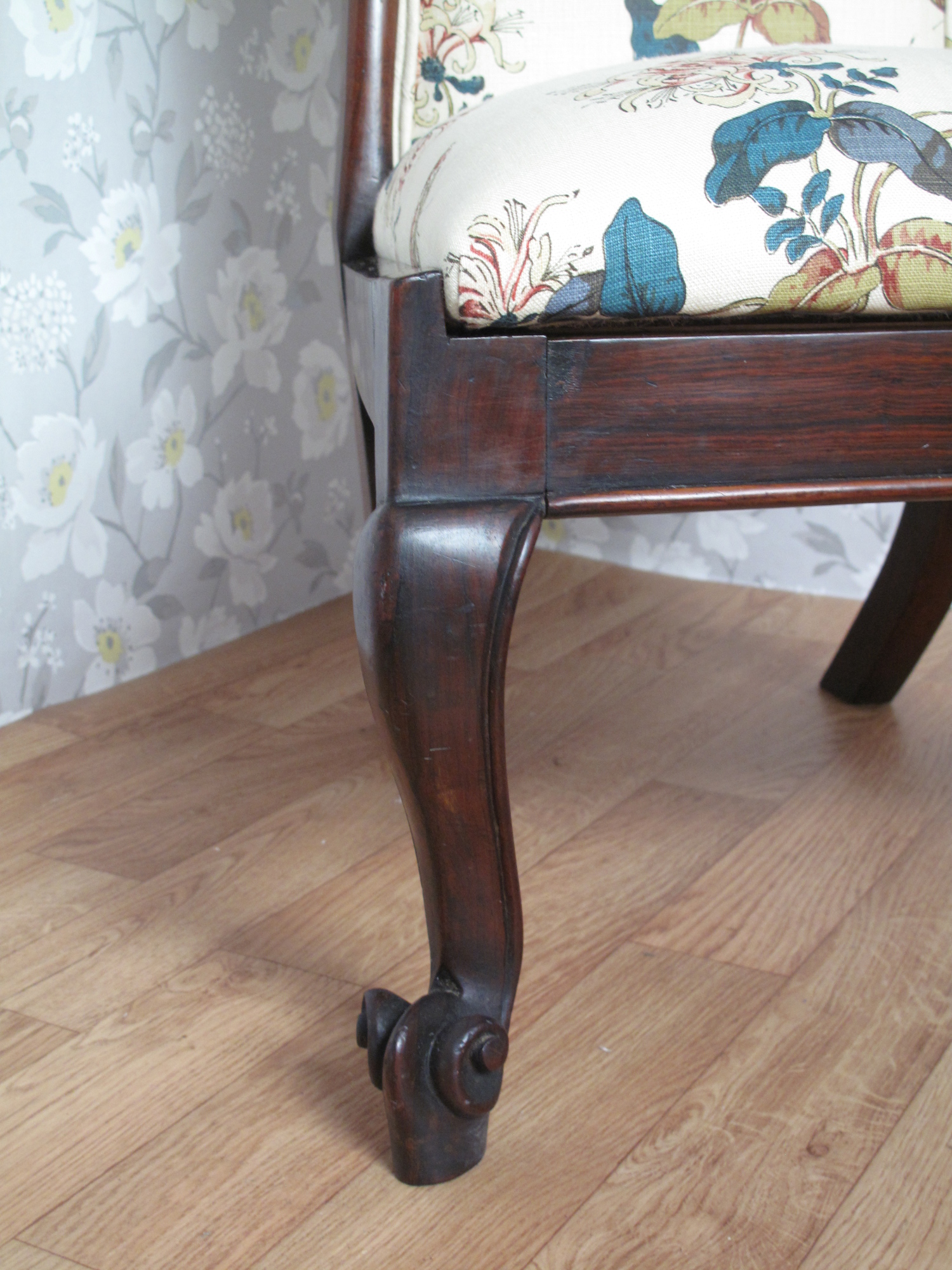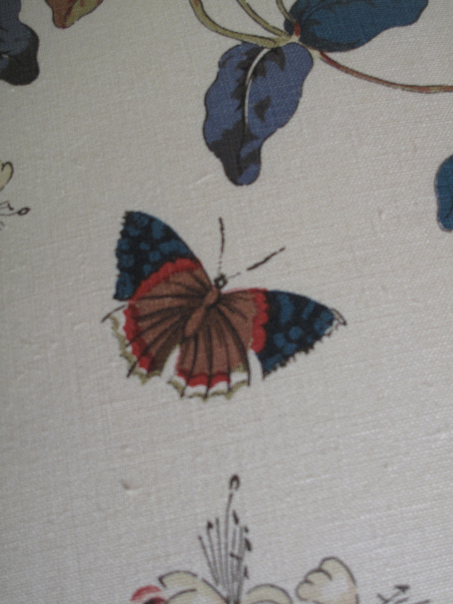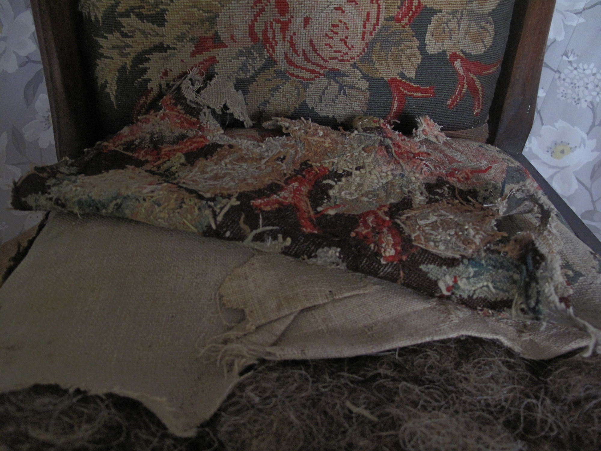 Fabulous Victorian Chair which had originally been covered in a tapestry. The seat was a drop in whilst the back was a panel. When stripping the chair back we found the original linen calico and the rear of the chair had been covered in silk. It was reupholstered using a linen with a delicate butterfly and foliage design.